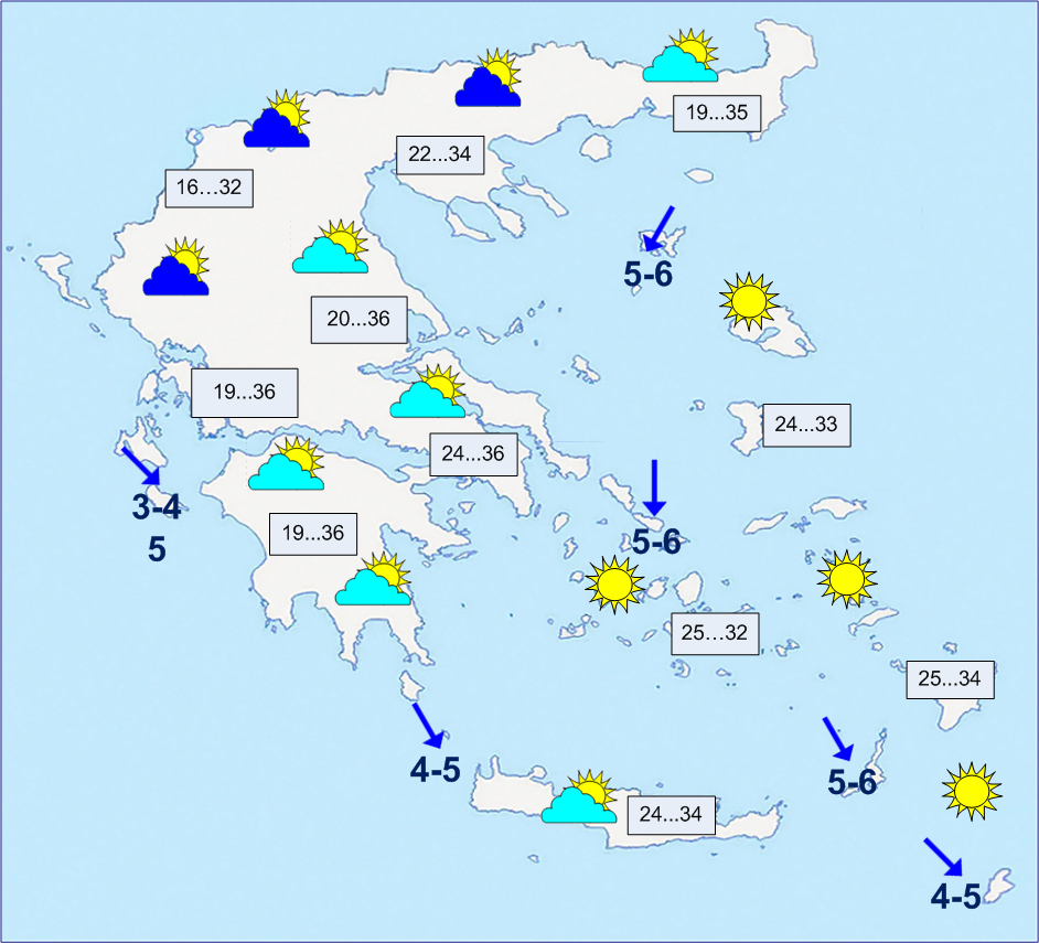 Κρήτη. Άνεμοι Β 4 με 6 μποφόρ. Θερμοκρασία από 22 έως 34 βαθμούς.